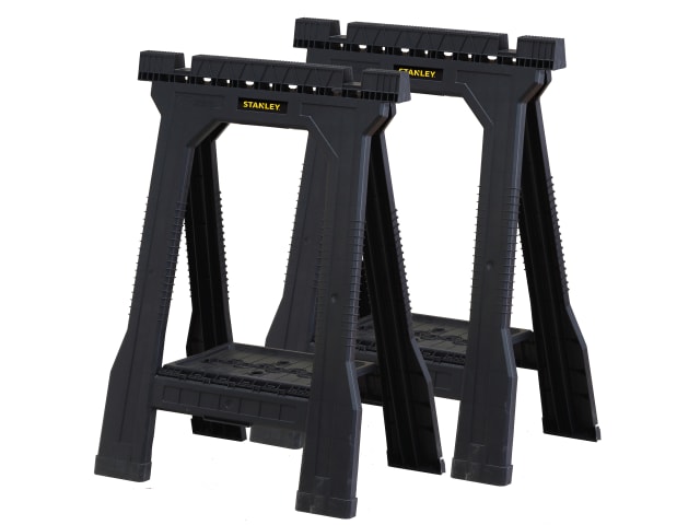 The Stanley 170355 Junior Sawhorses have an all plastic construction with Non-slip rubber inserts in the top for added grip when working on the project in hand and non-slip rubber feet for added stability and safety. The saw horses will fold flat for easy transportation and storage.